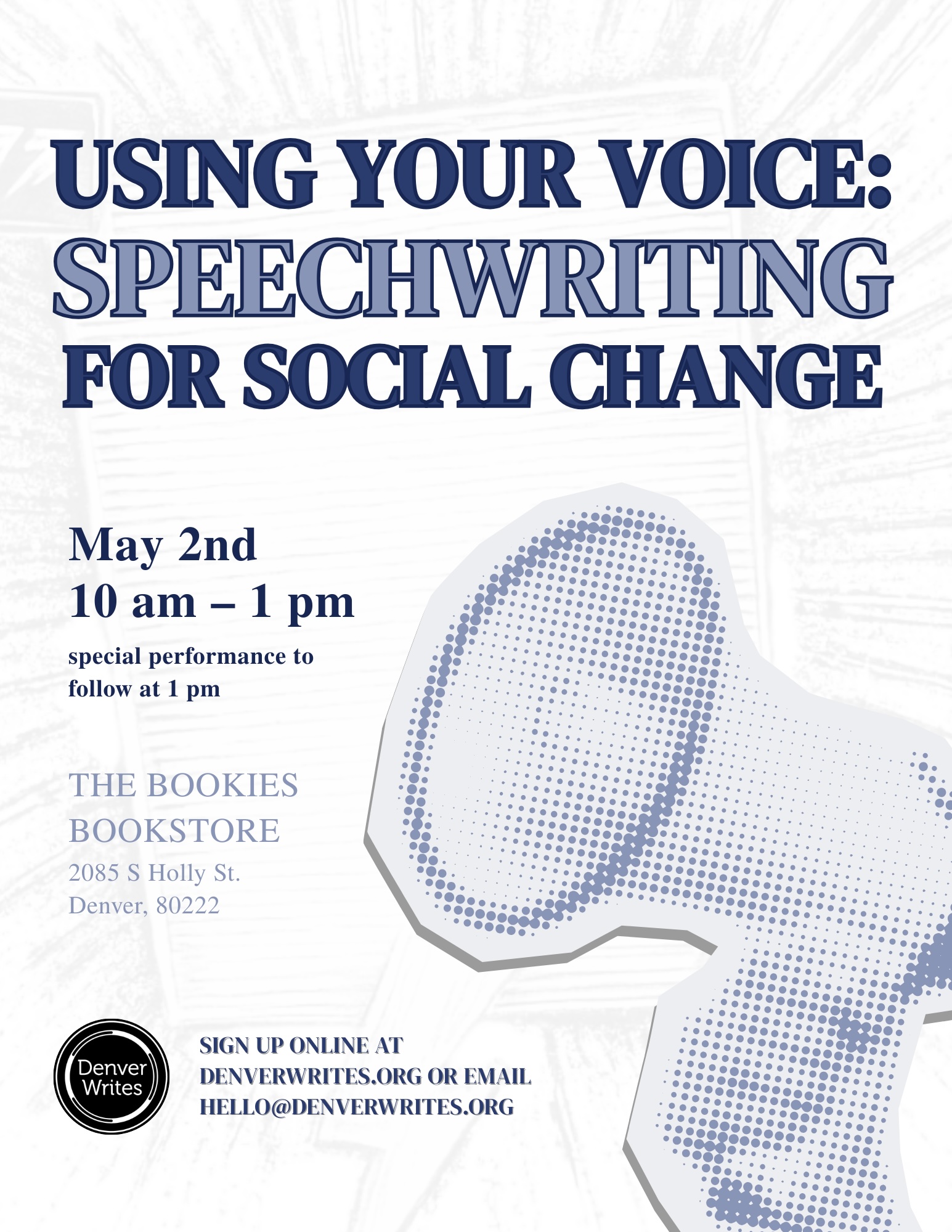 In this interactive workshop, writers will explore how our voices can inspire change. Participants will discover how language becomes power by learning the basics of speechwriting and persuasive storytelling. By the end of the workshop, each writer will have earned the confidence to perform a short speech about something they deeply care about with the purpose of inspiring social action.